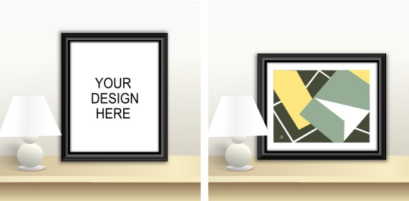 Download a free vector drawn mockup sample of an art frame on shelf. The zip file contains 3 PNG versions: